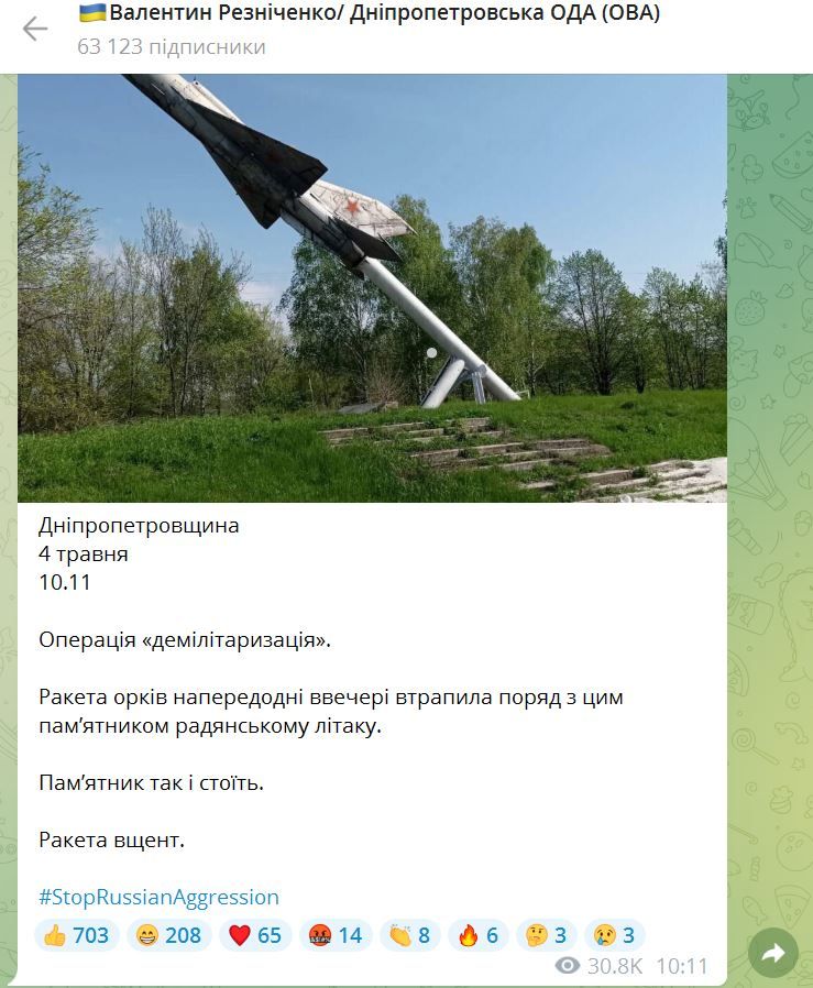 На Днепропетровщине вражеская ракета пыталась "демилитаризировать" памятник советскому самолету