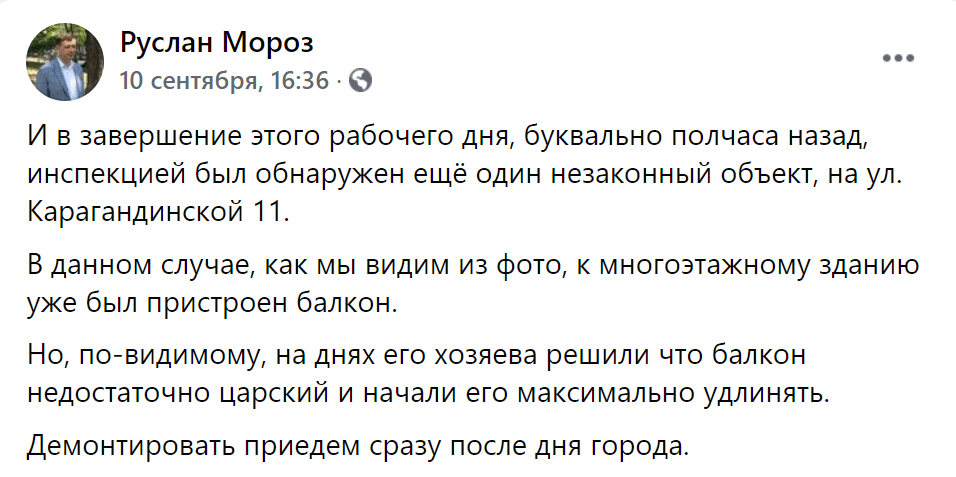 На улице Карагандинской, 11 живет предприимчивый днепрянин, который всяческими путями пытается увеличить свою жилплощадь. Сначала он построил царь-балкон на первом этаже, а недавно добавил к нему незаконную пристройку.