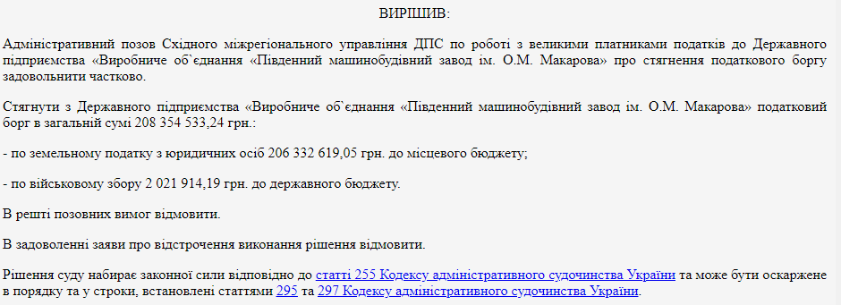 В документе говорится о том, что Днепропетровский окружной админсуд частично удовлетворил иск Восточного межрегионального управления Государственной налоговой службы, которая работает с крупными налогоплательщиками. Теперь "Южный машиностроительный завод имени Макарова" должен выплатить налоговый долг в сумме 208,35 миллионов гривен. Из них: