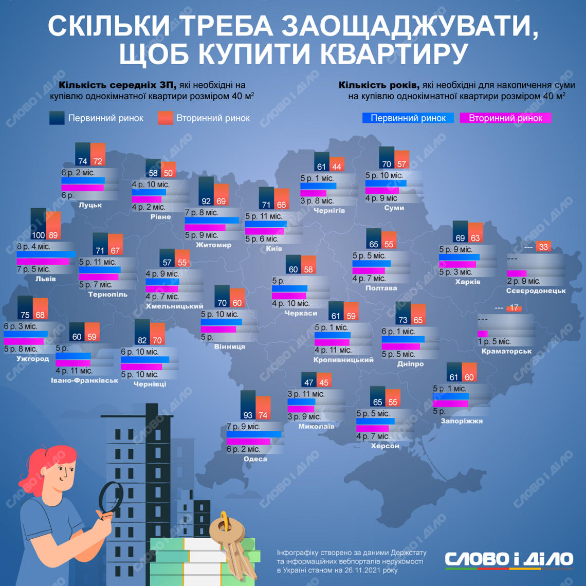 Журналисты аналитического портала "Слово і Діло" посчитали, сколько лет нужно копить жителям украинских городов. Для этого за основу они взяли среднюю зарплату и среднюю стоимость однокомнатной квартиры размером 40 кв.м. Они посчитали сколько времени нужно, чтобы накопить на квартиру на первичном и вторичном рынке. Отметим, что откладывать придется всю зарплату.