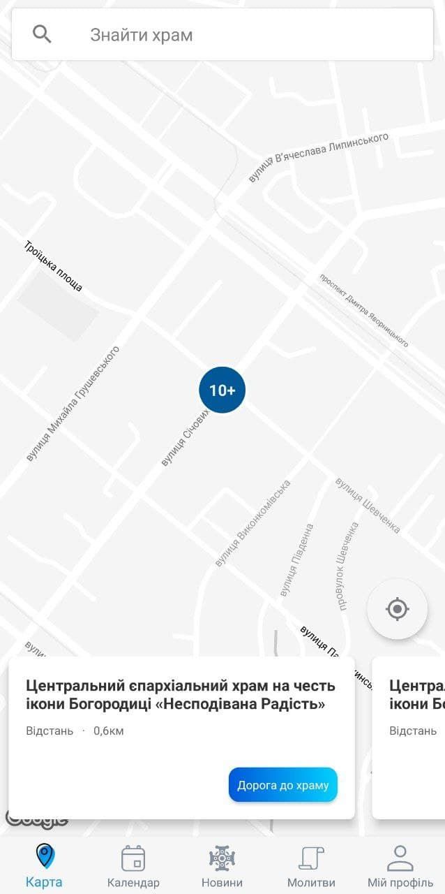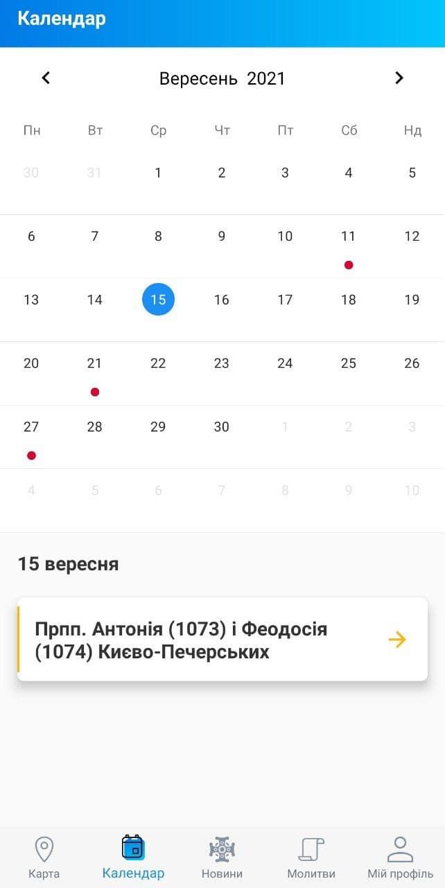 Интерфейс полностью на украинском. Приложение использует вашу геолокацию и показывает ближайшие к вам храмы. А в календаре можно узнать важные церковные даты. "Грешные" большие праздники отмечены красной точкой.