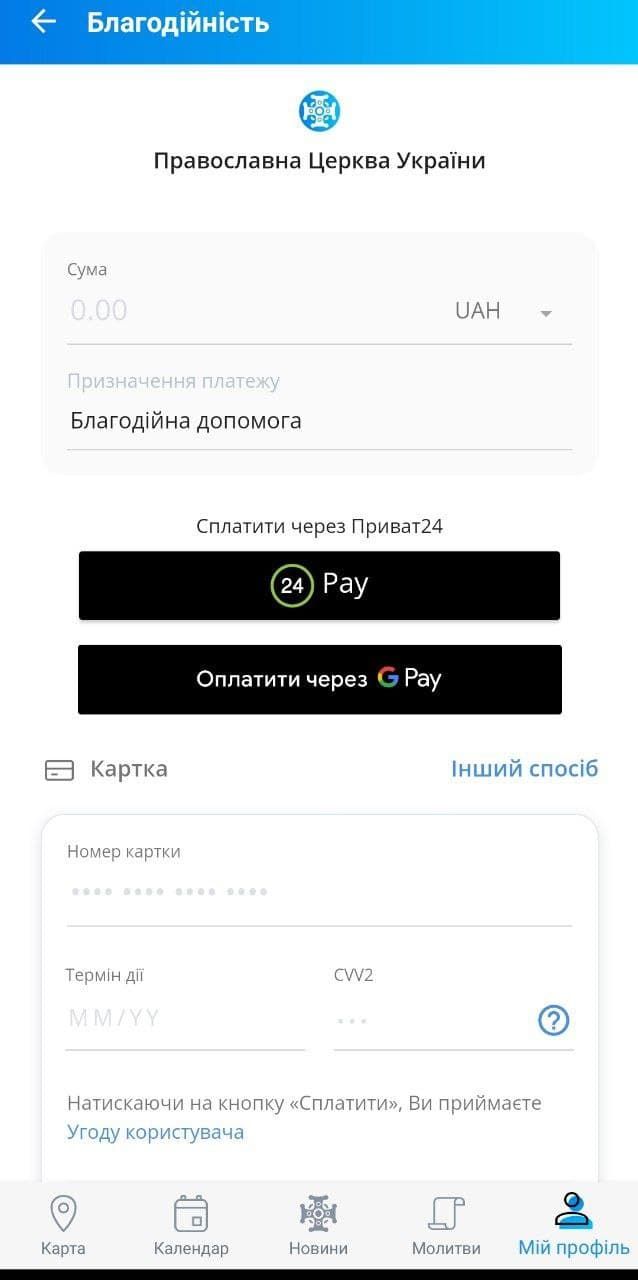 Можно также початиться со священником. Правда сделать это в самом приложении нельзя, вас перекинет на страничку ПЦУ в Facebook, где вы уже сможете задать вопрос или исповедаться. Есть раздел благотворительность, где можно сделать пожертвование на счет Православной Церкви Украины. Оплатить можно через google-pay или онлайн-банкинг.