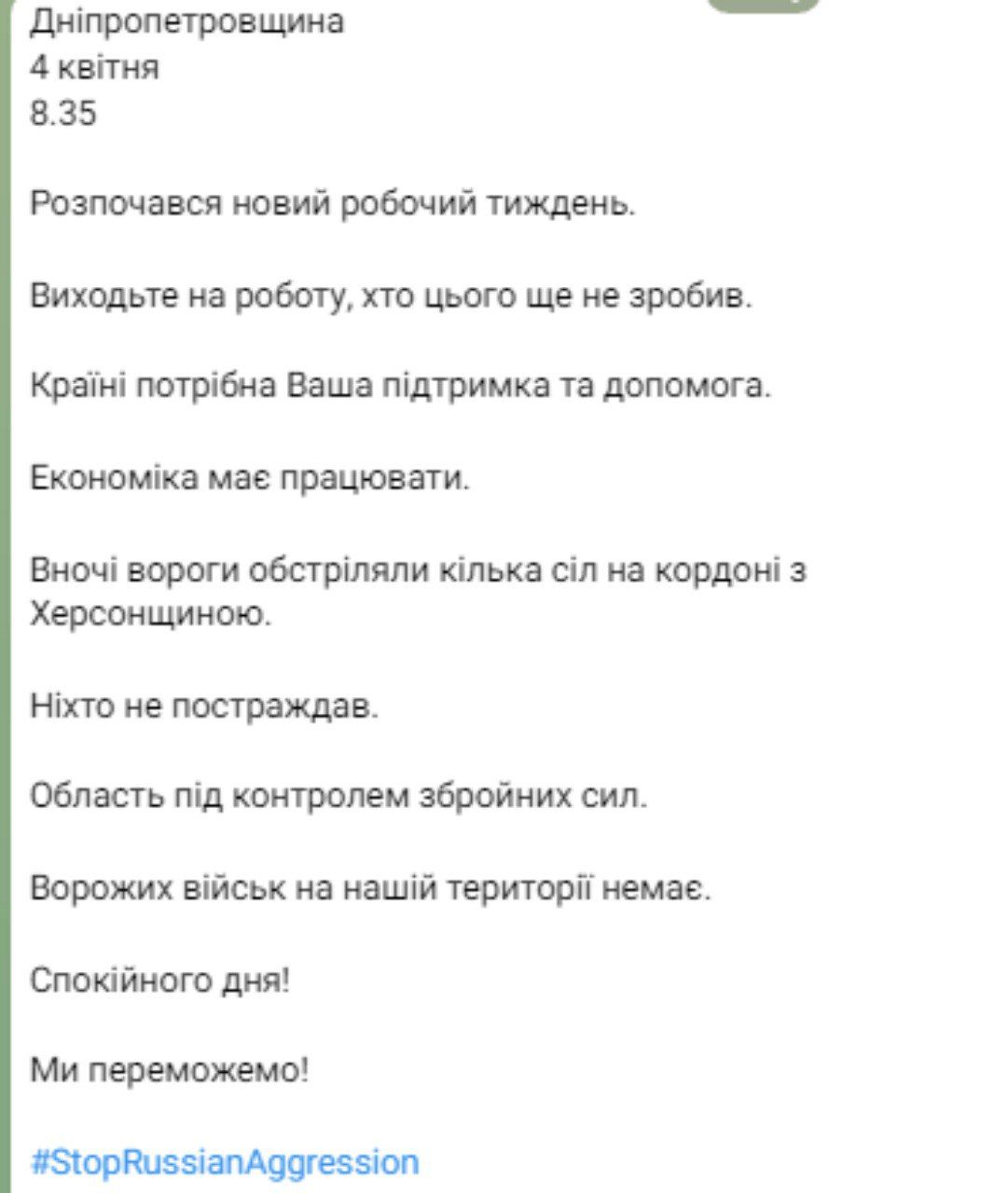 "Началась новая рабочая неделя. Выходите на работу, кто этого еще не сделал. Стране нужна поддержка и помощь. Экономика должна работать. Ночью враги обстреляли несколько сел на границе с Херсонщиной. Никто не пострадал. Область под контролем вооруженных сил. Вражеских войск на нашей территории нет. Спокойного дня! Мы победим!" - написал Валентин Резниченко.