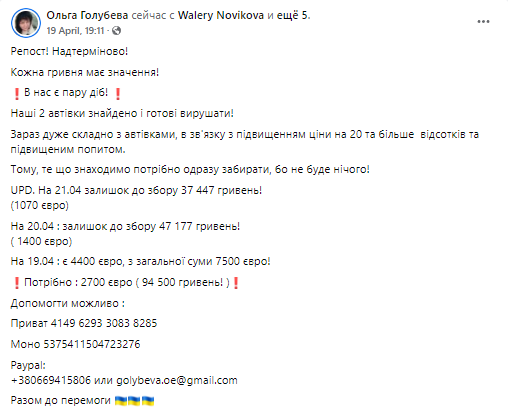 Автомобили уже нашли, и они готовы ехать в Украину. Изначально требовалось собрать 7500 евро, за два дня большую часть суммы уже закрыли. По состоянию на 21 апреля, осталось собрать 1070 евро, или же 37 447 гривен.