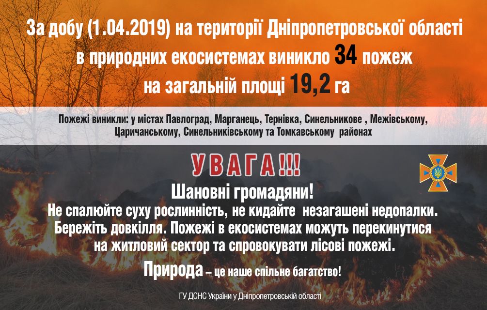 Отмечается, что только за минувшие сутки в Днепропетровской области в природных экосистемах произошло 34 пожара на общей площади 19,2 гектаров.