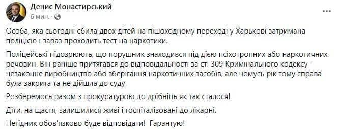 Как стало известно, полицейские предполагают, что водитель в момент аварии находился в состоянии наркотического опьянения. Глава МВД Денис Монастырский на своей странице в ФБ написал, что этот господин уже привлекался к уголовной ответственности за изготовление или хранение наркотиков.