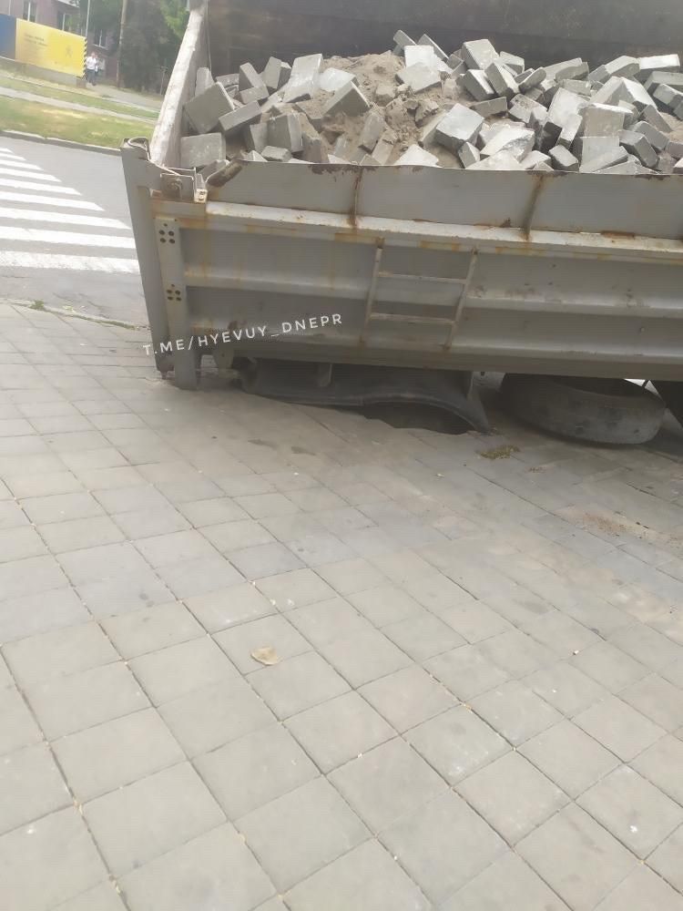 Сегодня утром, 8 июля, на проспекте Дмитрия Яворницкого и улицы Жуковского грузовик провалился в асфальт. Он перевозил тротуарную плитку. Что стало причиной аварии пока неизвестно. Причины произошедшего уточняются.