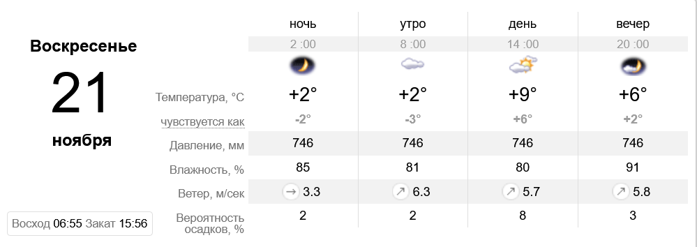 Будет небольшой ветер скорость до пяти метров в секунду. Согласно прогнозу, никаких осадков в воскресенье не предвидится, поэтому зонт можете смело оставлять дома.