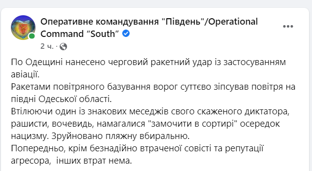 "Ракетами воздушного базирования враг существенно испортил воздух на юге Одесской области. Воплощая один из знаковых месседжей своего бешеного диктатора, рашисты, очевидно, пытались "замочить в сортире" очаг нацизма. Разрушен пляжный туалет", - говорится в сообщении.