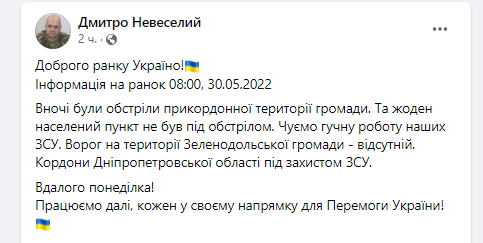 "Ночью были обстрелы приграничной территории громады. Но ни один населенный пункт не был под обстрелом. Слышим громкую работу наших ВСУ. Враг на территории Зеленодольской громады – отсутствует. Границы Днепропетровской области под защитой ВСУ. Удачного понедельника! Работаем дальше, каждый на своем направлении для Победы!" - написал Дмитрий Невеселый.