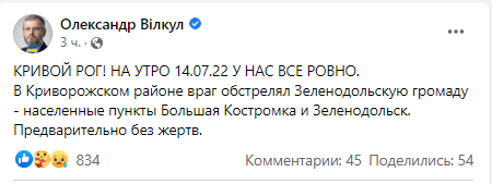 "Кривой Рог! На утро 14.07.2022 у нас все ровно", - отметил Александр Вилкул.