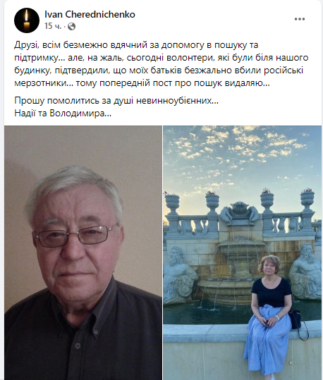 «Друзья, всем безгранично благодарен за помощь в поиске и поддержку… но, к сожалению, сегодня волонтеры, которые были у нашего дома, подтвердили, что моих родителей безжалостно убили российские мерзавцы… поэтому предыдущий пост о поиске удаляю… Прошу помолиться за души невинноубиенных Надежды и Владимира», – написал Иван Чередниченко.