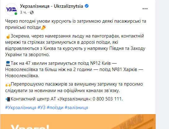 В частности, на несколько часов задержались поезда, которые идут через Днепр. Это поезд №12 Киев — Новоалексеевка и №81 Харьков — Новоалексеевка (идет через Павлоград). Случилось это из-за намерзания льда на пантографах и контактной сети.