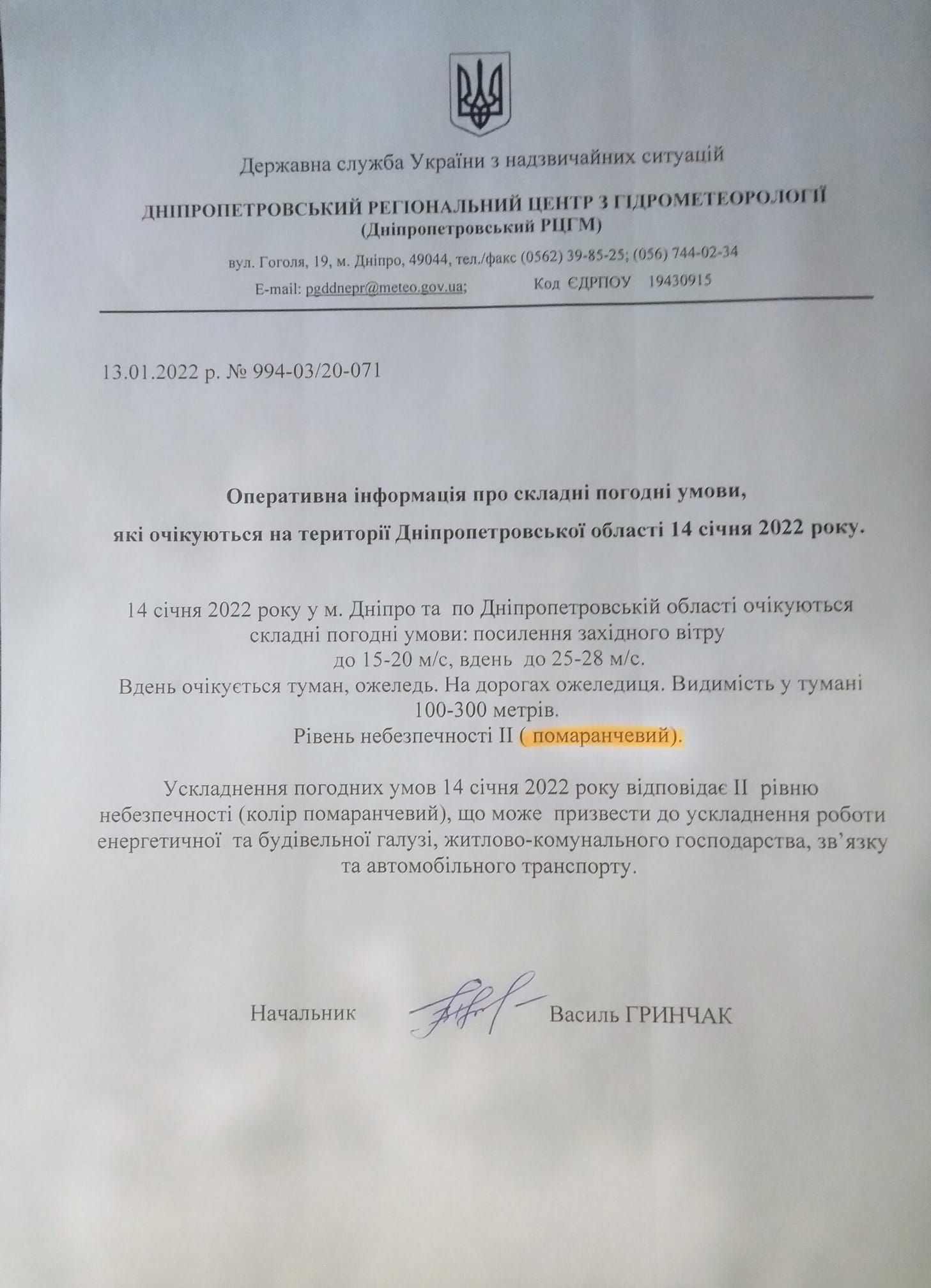 Об этом сообщил начальник Днепропетровского регионального центра по гидрометеорологии Василий Гринчак.