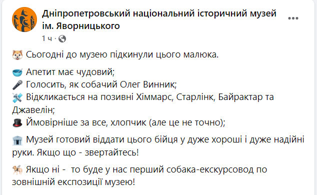 "Аппетит у него хороший. Откликается на клички "Химмарс", "Старлинк", "Байрактар" и "Джавелин". Вероятнее всего, мальчик (но это не точно). Мы готовы отдать малыша в очень хорошие руки. А если нет, то будет у нас собака-экскурсовод по внешней экспозиции музея!" - говорится в посте на странице музея.