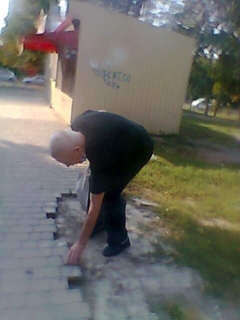 Очередной акт вандализма успел зафиксировать на камеру телефона местный житель Владимир Бондаренко. Полученные кадры он опубликовал в соцсетях. На фотографиях можно увидеть пожилого мужчину, который разбирает тротуар, вытаскивая из него плитку за плиткой. В руках у него пакет, в который хулиган, по всей видимости, прячет свои "трофеи".