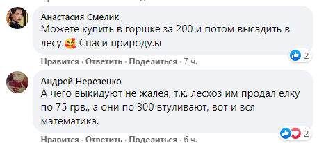 В комментариях предлагают вполне разумные и экологичные варианты новогоднего дерева. Можно за двести гривен купить ель в горшке и после праздников высадить в лесу. Таким образом и праздник будет, и поможем нашей природе.