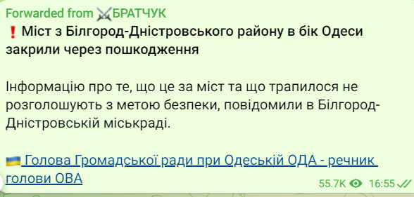 "Мост из Белгород-Днестровского района в сторону Одессы закрыли из-за повреждений. Информацию о том, что это за мост и что случилось, не разглашают в целях безопасности, сообщили в Белгород-Днестровском горсовете", — написал Братчук.