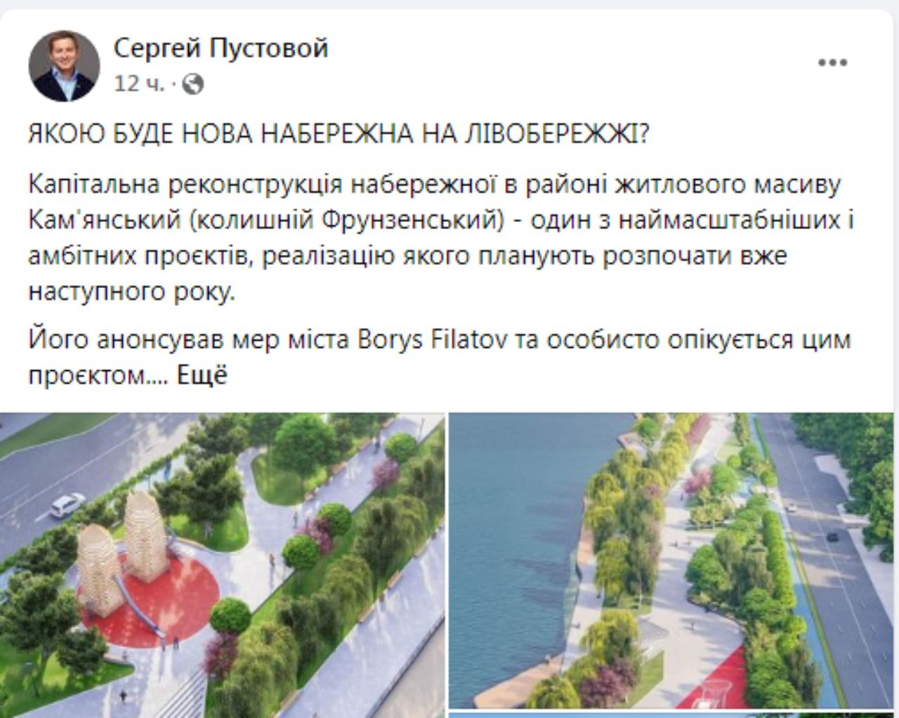 Об этом на своей странице написал депутат Днепровского городского совета Сергей Пустовой.