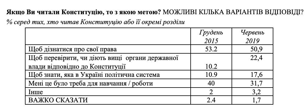В то же время изменились мотивы ознакомления с Основным Законом страны. Если в 2015 году 40 % украинцев читали Конституцию, так как нуждались в этих знаниях для учебы или работы, сегодня это является главной целью для 32 %. Теперь граждане чаще обращаются к Конституции, чтобы проверить, действуют ли высшие органы власти в соответствии с Основным Законом (22 % в 2019 году и 10 % в 2015).