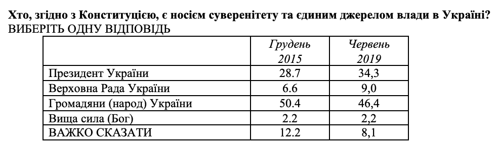 Почти половина опрошенных (46,4 %) знает, что, согласно Конституции, носителем суверенитета и источником власти в стране является народ Украины. В то же время 34,3 % респондентов считают, что таким субъектом является Президент.