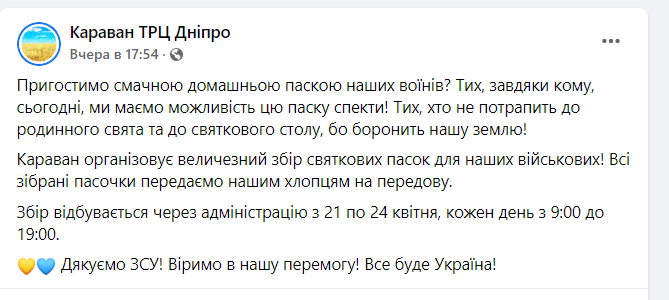 "Караван" организовал сбор праздничных пасок для наших военных! Все собранные пасочки передадим нашим ребятам на передовую!" - сказано в сообщении.