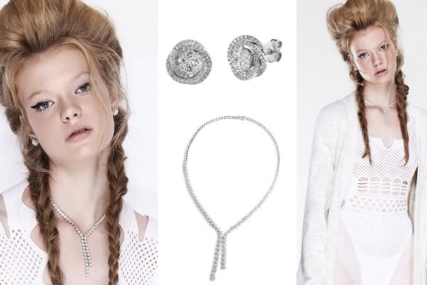 Если же в свадебном образе особый акцент был сделан на прическе, то стилистика украшений должна быть более элегантной и сдержанной. В качестве варианта следует рассмотреть пуссеты с бриллиантами и колье для выделения изгиба шеи.