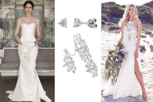 Свадебное платье должно вызывать восторг у гостей торжественного мероприятия, но при этом оно должно быть удобным. Если же модель платья имеет открытый верх с отсутствием бретелек, то к такому образу подойдут серьги с кружевным узором и бриллиантами. Украшение поможет выделить женственность и нежность невесты.