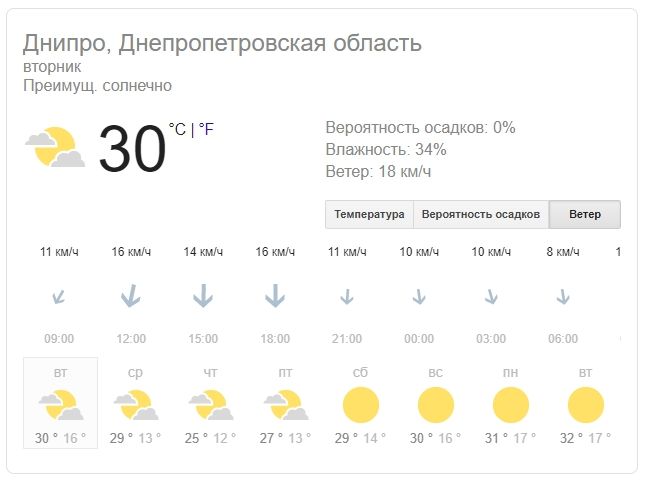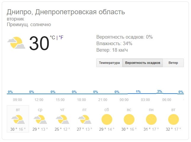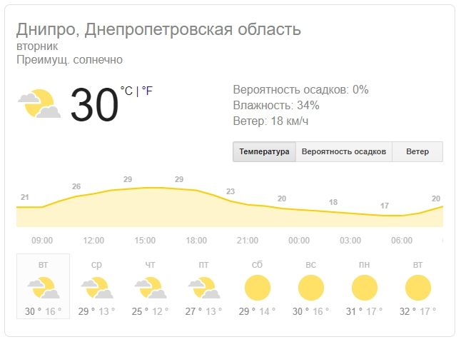 По прогнозу синоптиков, ближайшие 5 дней в Днепре температура воздуха продержится в пределах 25 — 30 градусов, ночью - 12 - 16 градусов.