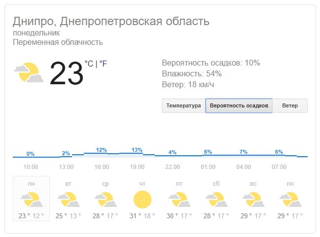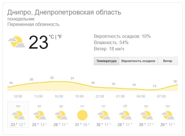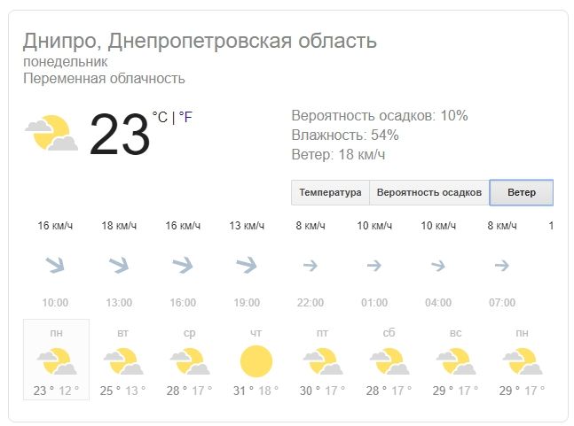Первая половина дня в Днепре будет ясной, а после обеда на небе появятся облака. Без осадков. Днем столбик термометра покажет 22 — 23 градуса. Температура воздуха ночью — 14 — 15 градусов. Порывы ветра до 4-5 м/сек.