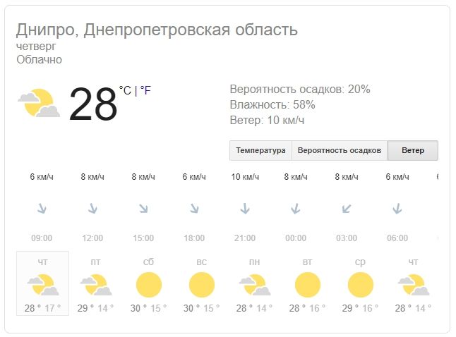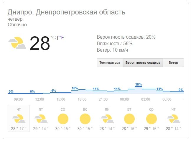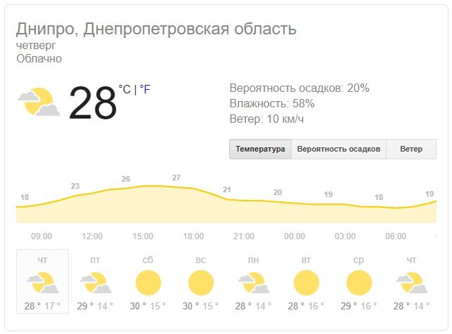 По прогнозу синоптиков, ближайшие 5 дней в Днепре температура воздуха продержится в пределах 28 — 30 градусов, ночью — 14 — 16 градусов.