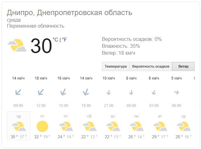 Сегодня на протяжении всего дня, небо в Днепре будет покрыто облаками. Днем столбик термометра покажет 27 — 30 градусов. Температура воздуха ночью — 17-20 градусов. Осадки обойдут Днепр стороной. Порывы ветра до 4-5 м/сек.
