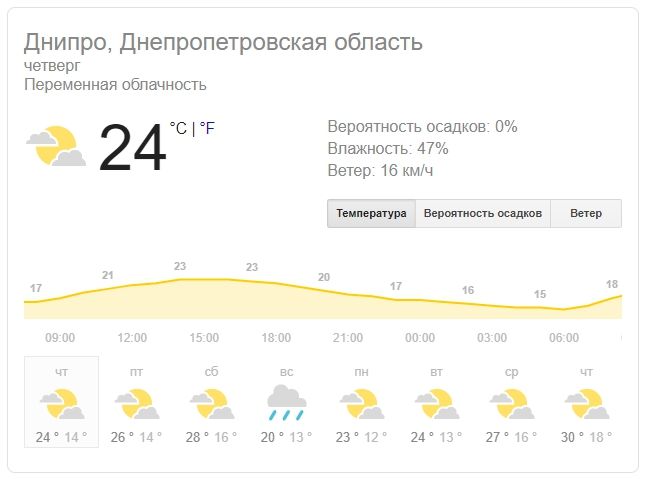 По прогнозу синоптиков, ближайшие 5 дней в Днепре температура воздуха продержится в пределах 20 — 28 градусов, ночью - 12 - 16 градусов.