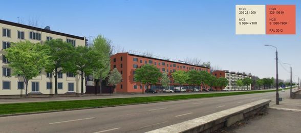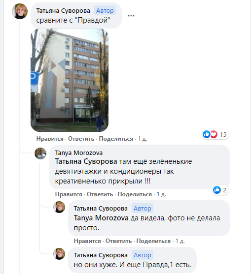 По задумке художников, таким образом можно будет создать так называемый кудонёр - парадный двор перед зданием. Сейчас, когда на улице нет зелени дом действительно выглядит слишком ярким, но летом, когда деревья перед домом обрастут листьями, многоэтажка не будет такой "вызывающей". Средний дом сделали более ярким, а два других - покрасили в белый, чтобы расставить акценты и общая картина смотрелась более гармонично.