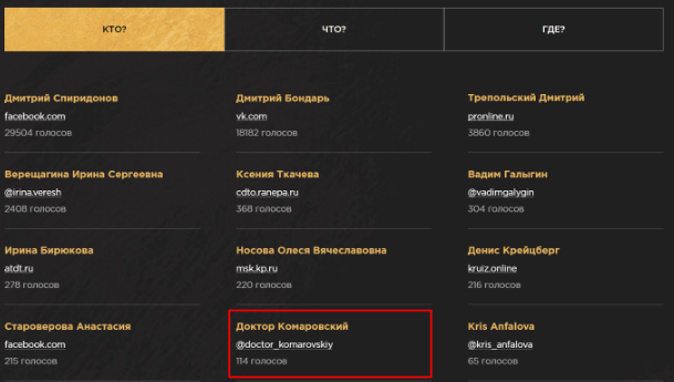 "Рунет 2021" - российская премия, в рамках которой выбирают лучших деятелей интернета, которые внесли значимый вклад в развитие интернет-отрасли РФ. Наш доктор Комаровский каким-то образом оказался среди участников в номинации "Лучший цифровой лидер". Правда его кандидатура находиться в разделе премии "Народное голосование". Возможно российские поклонники украинского доктора поспособствовали этому. Всего за него проголосовало около сотни человек.