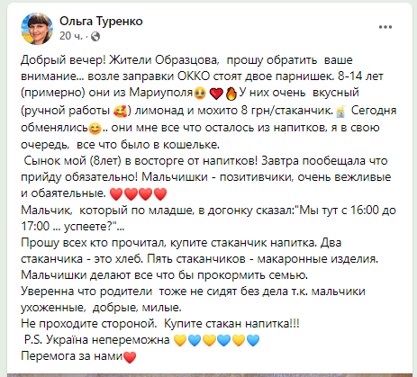 «Два стаканчика – это хлеб, пять стаканчиков – макаронные изделия. Мальчишки делают все, чтобы прокормить семью. Уверенна, что родители тоже не сидят без дела. Мальчики добрые и милые. Не проходите стороной. Купите стакан напитка», - написала Ольга Туренко.