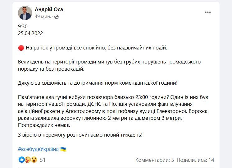 По его словам, вечером в субботу жители громады могли слышать два громких взрыва. Как оказалось, были попадания вражеских ракет неподалеку от Апостолово. Упала одна из ракет в поле, оставила воронку глубиной в 2 метра. Пострадавших в результате удара не было.