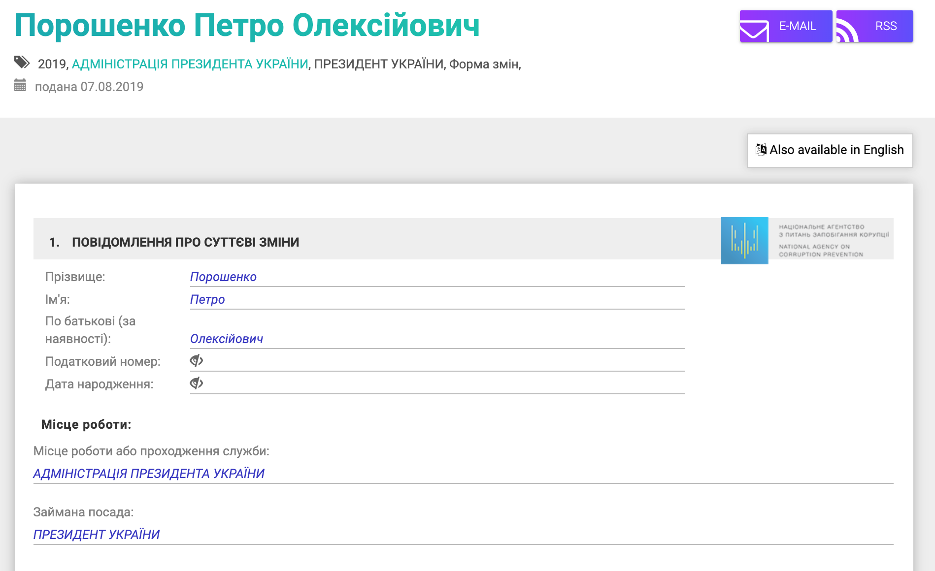 Бывший глава государства подал декларацию 7 августа 2019 года, в которой указал его местом работы Администрацию президента, а занимаемую должность – президент Украины.