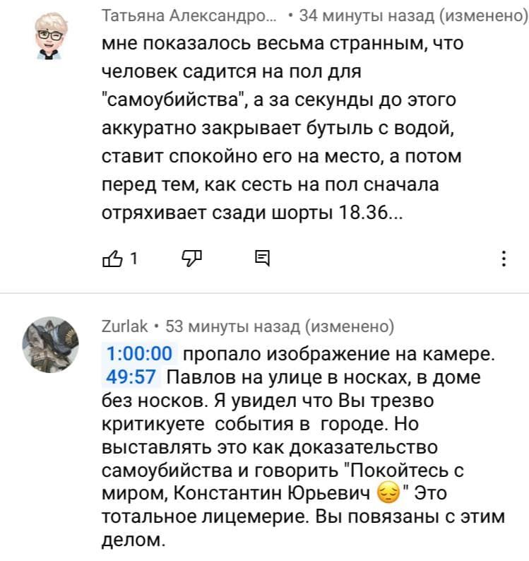 "В комментариях мне предлагали передать видеозаписи родственникам для ознакомления. С радостью поделюсь оригиналами видео с супругой или сыном Константина Юрьевича, лично. К сожалению, среди моих знакомых, контактов семьи бывшего мэра, ни у кого не нашлось. Я не призываю никого ни к каким выводам или умозаключениям. Смотрите видео сами и пусть каждый сам для себя решит, это было убийство или суицид. Покойтесь с миром, Константин Юрьевич", - написал блогер в своем Телеграм-канале.