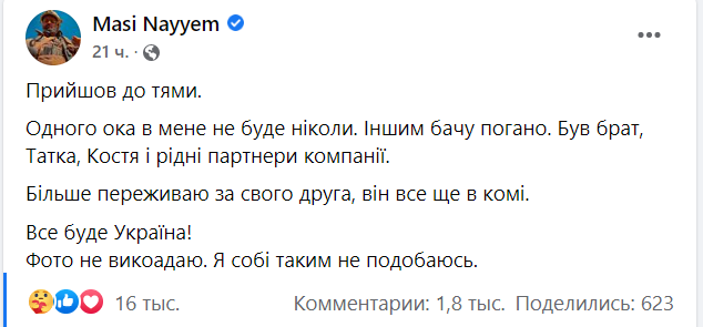 Потерял один глаз: Маси Найем пришел в себя и написал о своем состоянии