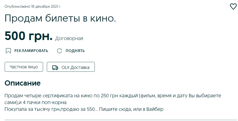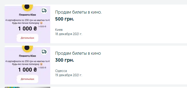 Популярностью пользуются и билеты в кино. Можно найти и за 500 гривен, и за 300.