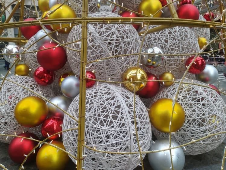 По фотографиям видно, что елку сделали из золотого конусообразного каркаса, внутрь которого поместили украшения, а снаружи обмотали гирляндой. Шары больших размеров белого цвета изготовили из лозы, а рядом с ними положили игрушки золотого, серебристого и красного цветов.
