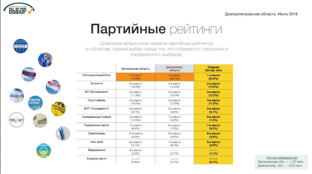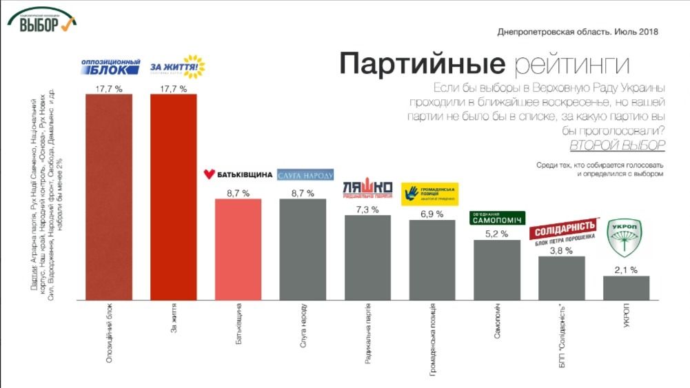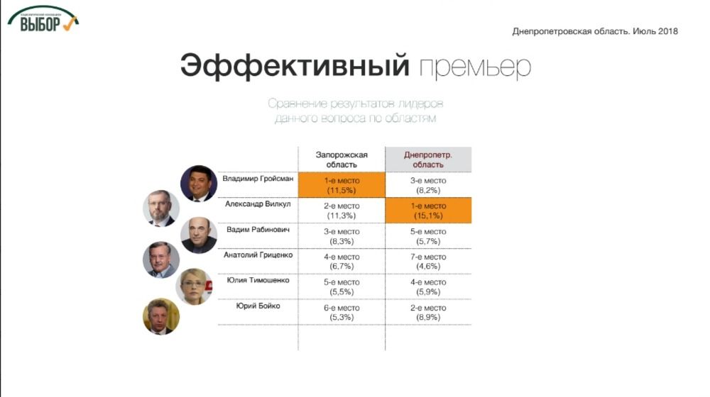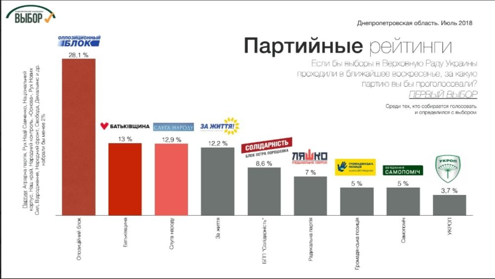 Согласно данным исследования, партийный рейтинг консервативных сил в Днепропетровской области также близок к 40%. При этом «Оппозиционный блок» является безусловным электоральным лидером с результатом (28,0%), что в два раза больше, что в два раза больше, чем у «Батькивщины» (13,0%), занимающей вторую строчку рейтинга. Кроме того, в ходе исследования социологи измеряли и так называемый «премьерский рейтинг».