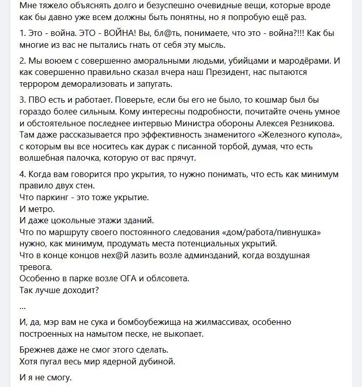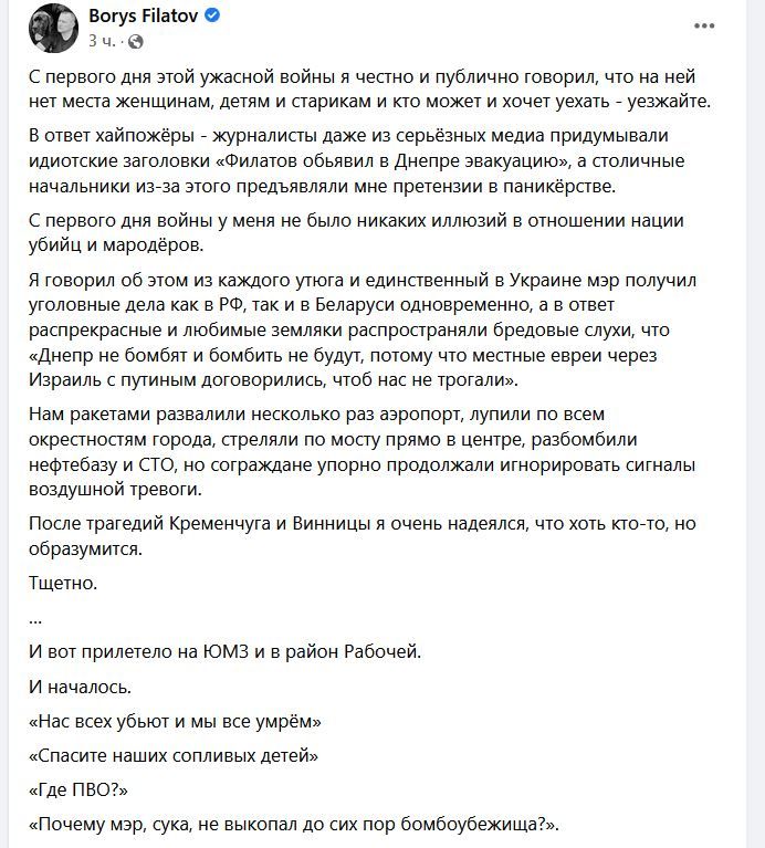 І ось прилетіло на ЮМЗ і в район Робочої. І почалося. Нас всіх вб'ють і ми помремо. Де ПВО, - сказав Філатов.