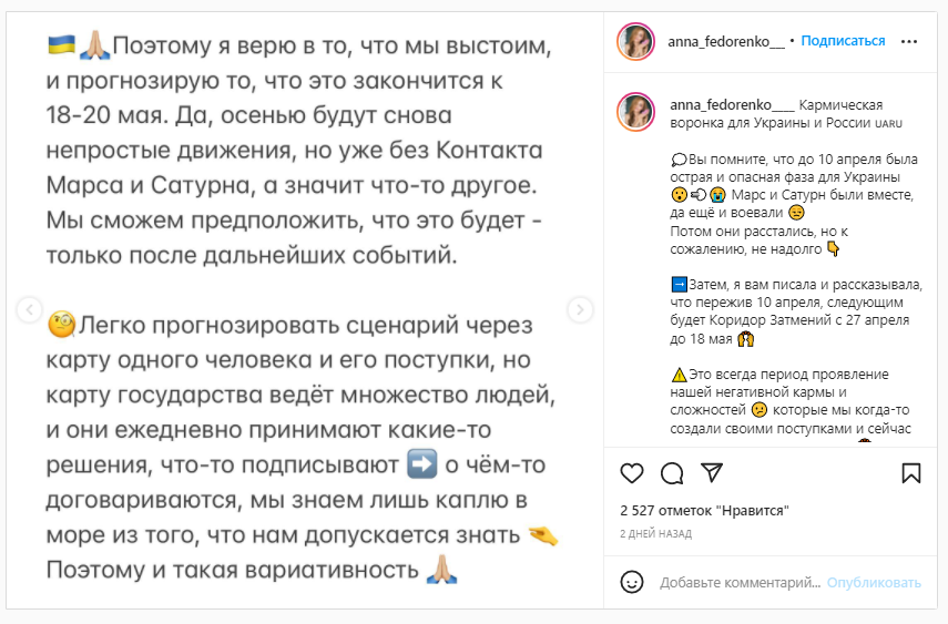 «Кармическая воронка будет являться переворотной для нас всех, а особенно для Украины. Я верю в то, что мы выстоим и прогнозирую, что все закончится к 18-20 мая. Легко делать прогноз для одного человека, но карту государства ведет множество людей, и они ежедневно принимают решение, поэтому и такая вариативность», - отметила Анна Федоренко.