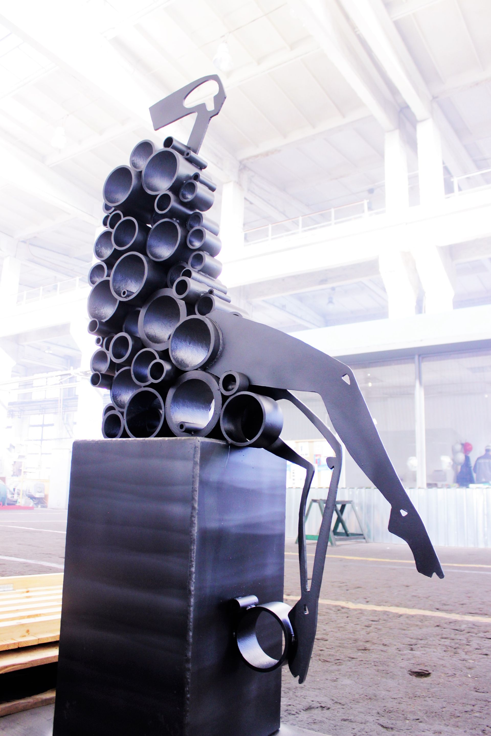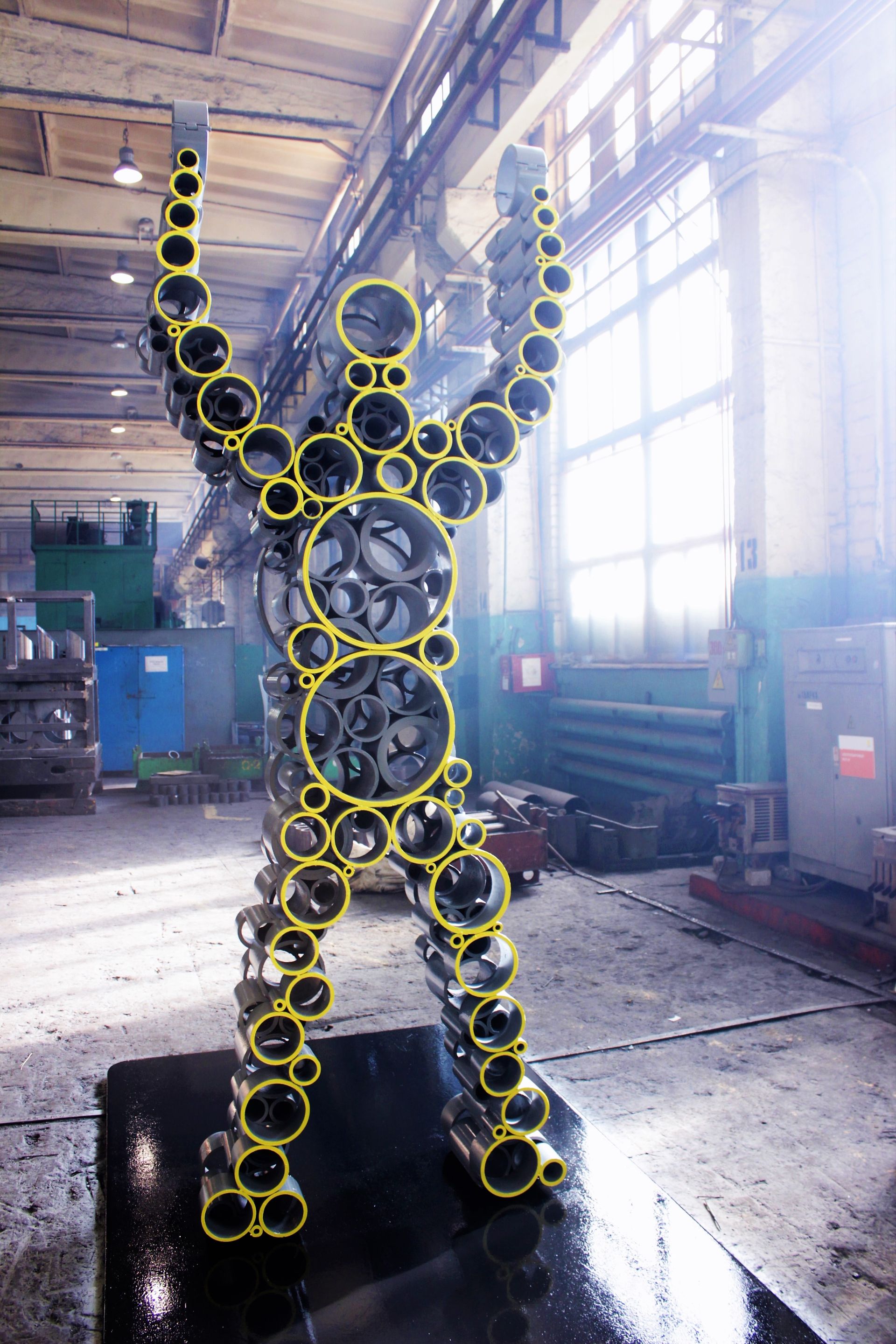 Вторая скульптура имеет шутливое название «штангист». Это трехметровая фигура человека, которая поднимает колесные пары. Идея образа – показать силу рабочих, работающих на заводском производстве.