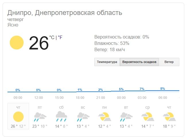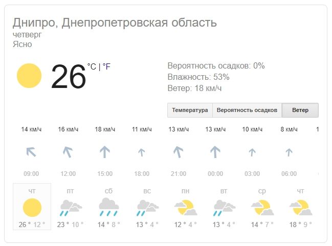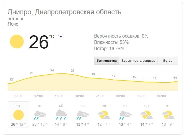 С утра небо в Днепре было ясным, таким оно и останется до завершения дня. Днем столбик термометра покажет 24 — 26 градусов выше нуля. Температура воздуха ночью — 12 — 14 градусов тепла. Порывы ветра 3-4 м/с. Без осадков.