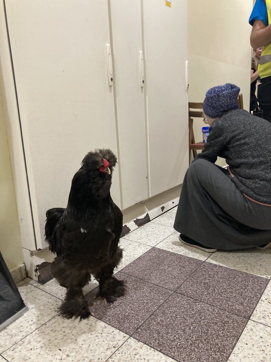 Волонтеры улыбаются и говорят, что петух Тоша выглядит так, словно это он бабушку эвакуировал из Мариуполя.