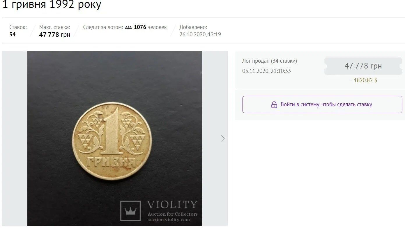 Особенно ценными считаются денежные знаки 1992 года выпуска, за которые коллекционеры готовы платить до 50 тысяч гривен. Самая редкостная – монета номиналом в одну гривну 1992 года выпуска. Например, по данным аукциона Violity такую монету недавно продали за 47 778 грн.