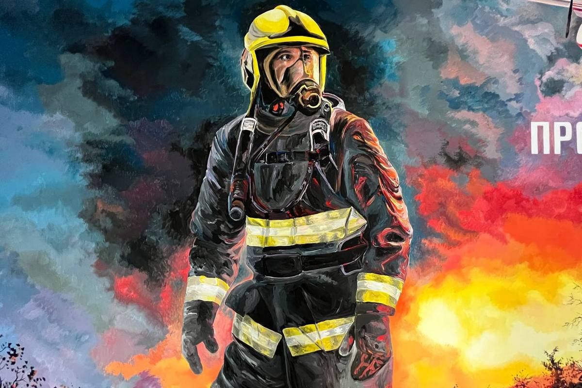 Художница Лилия Токарева изобразила спасателя в полном обмундировании, который стоит на фоне пламени. Рядышком надпись - «Прожити одне життя, щоб врятувати тисячі».